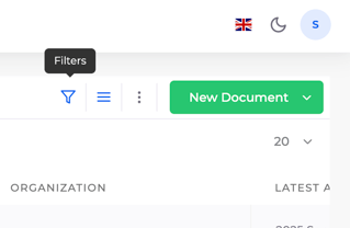 Use the search bar or the filter icon (funnel symbol) in the top right corner to find specific documents.