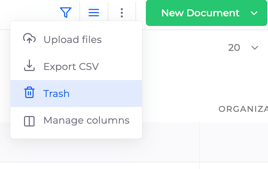 To permanently delete or restore documents from the Trash, select the documents you want to manage and then click the corresponding green button in the bottom-right corner to perform the desired action.
