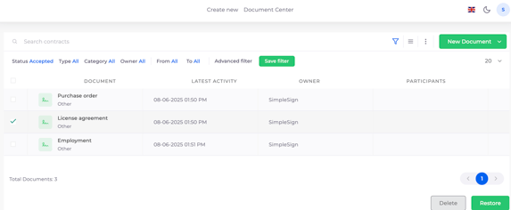 The document repository provides a centralized location where you can store, manage, and track all your documents. In addition to monitoring sent and signed files, you can also save drafts and upload documents for internal use.