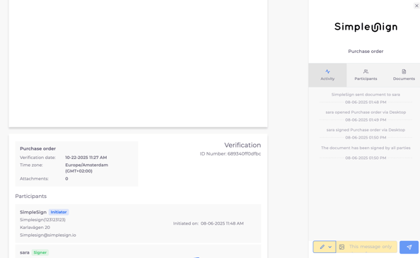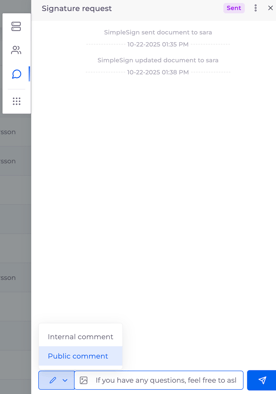 Under Activities, you can track document activity and view the audit trail in real time. You can also write internal comments, and if Document Chat is enabled, you can view the chat here as well.